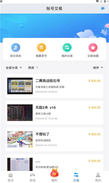 4、点击交易页面,用户可以看到各类游戏账号