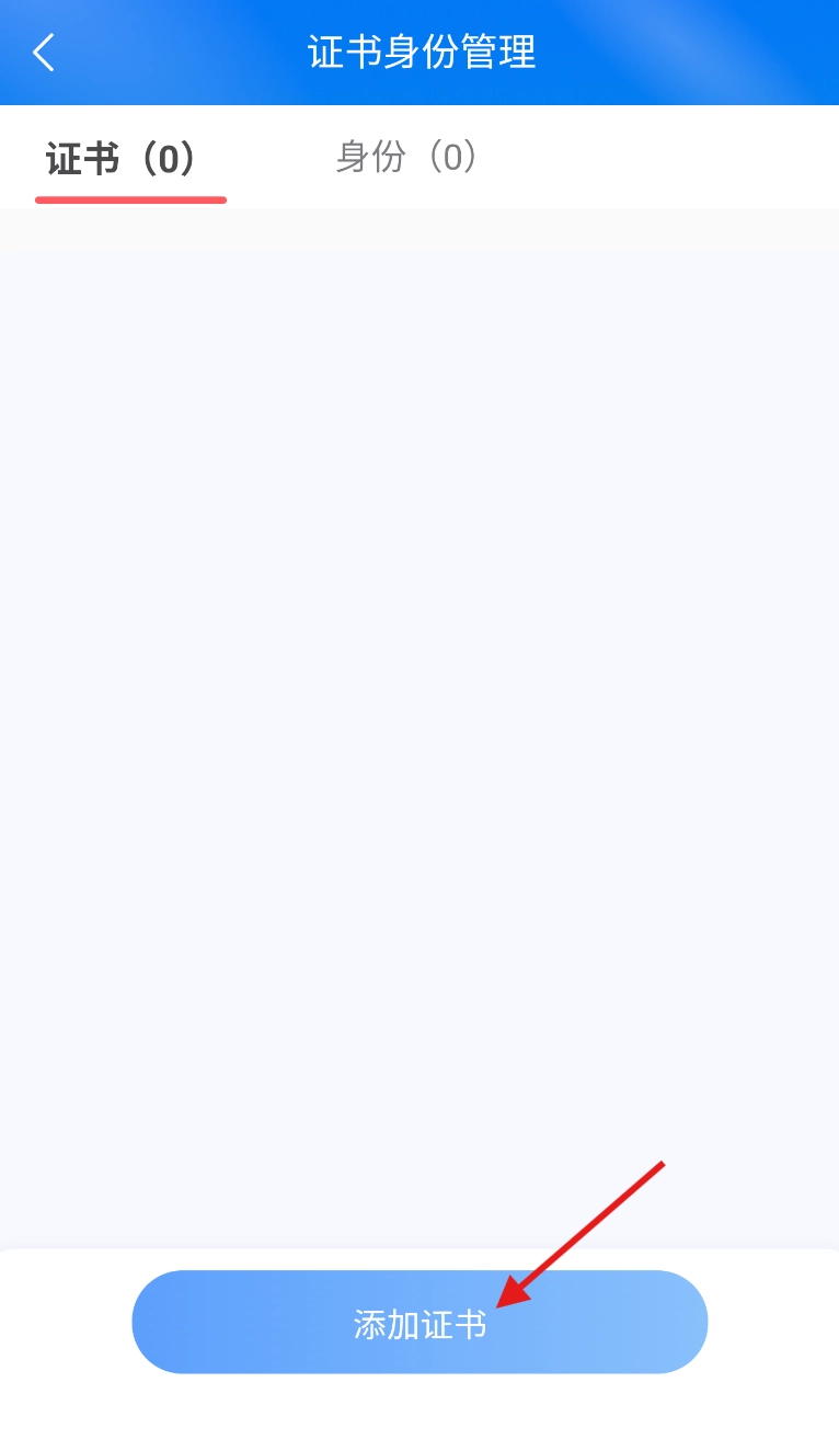 3、进入证书身份管理页面后,找到并点击醒目的“添加证书”按钮,以此启动证书录入流程。