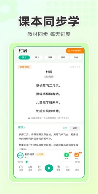 名师范读,课文同步,支持本课循环、单元循环、列表循环等多种循环模式、语速调节、定时播放等实用功能,孩子随时随地都能听。既能提升听力理解,又能培养语感和语言表达能力,还可加深对课文的理解,助力孩子学习更上一层楼。