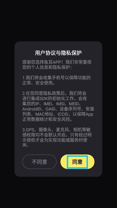 在本站安卓网打开鱼耳应用,仔细阅读弹出的用户协议和隐私保护政策,然后点击【同意】按钮。