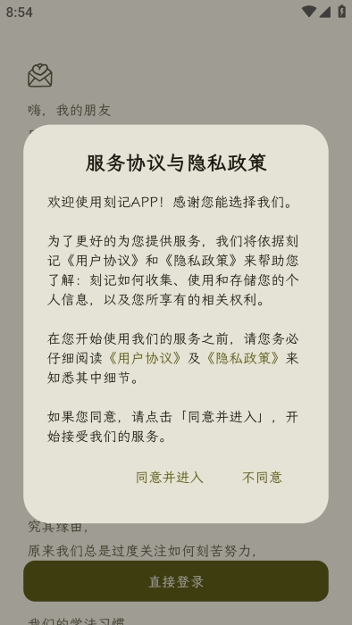 查看你的服务协议与隐私政策,同意并进入。