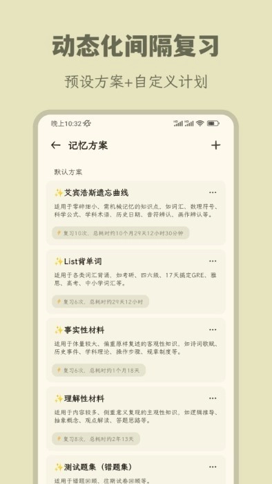 科学预设了多种针对不同知识属性的复习周期方案,同时也提供了间隔重复的具体运作规则,供用户自主选择。