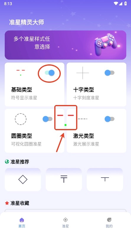 进入首页后,就能看到基础类型、十字类型以及圆圈类型的准星样式。