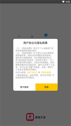 1、并安装打开套路大全,阅读协议自行选择是否同意