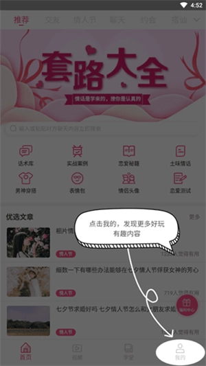 套路大全是厦门漫娱网络科技有限公司专门为单身适龄青年设计开发的在线聊天社交软件,它主要针对当代年轻人的“社恐”问题进行研发,能为用户提供土味情话、网上撩妹、异性搭讪、线下聊天等大量实用的聊天技巧,目的是帮助他们更好地了解异性心理,进而全面适应各种社交场景。
