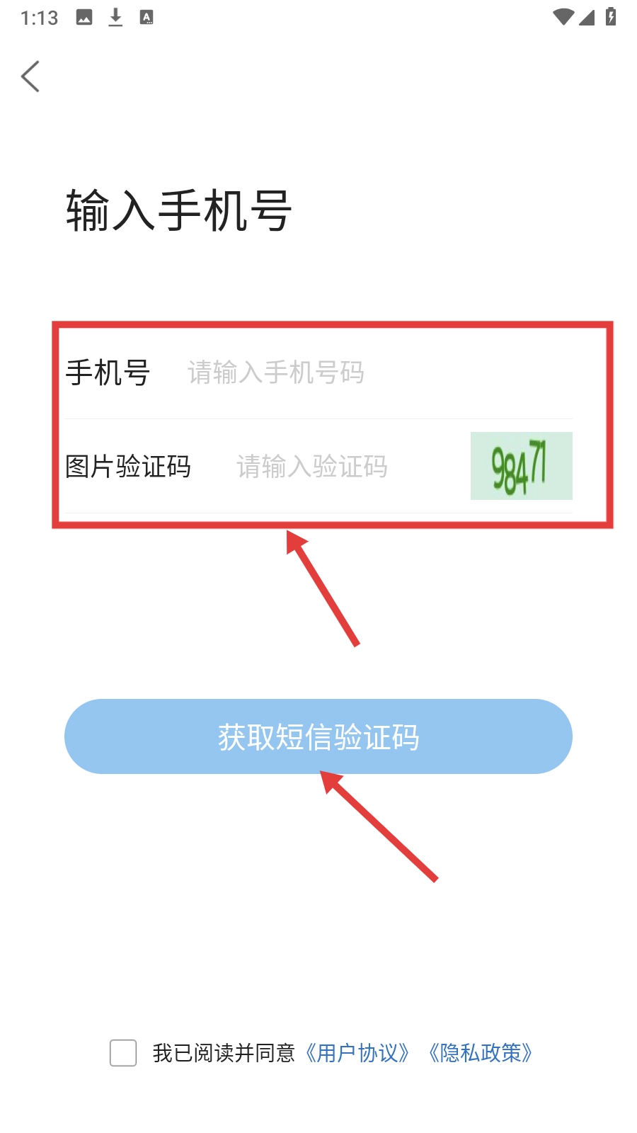 4、在注册页面填写手机号码并输入图片验证码,点击【获取短信验证码】按钮,就能继续完成后续的注册步骤。