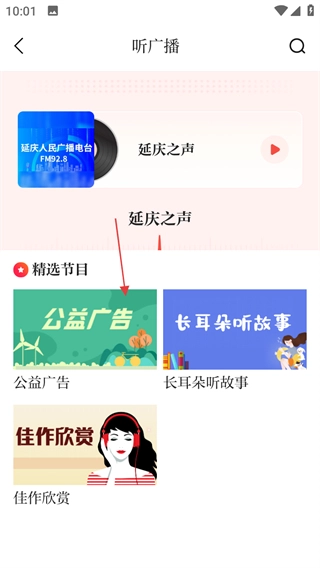 2、在听广播页面,点击公益广告,进入公益广告播放页面。